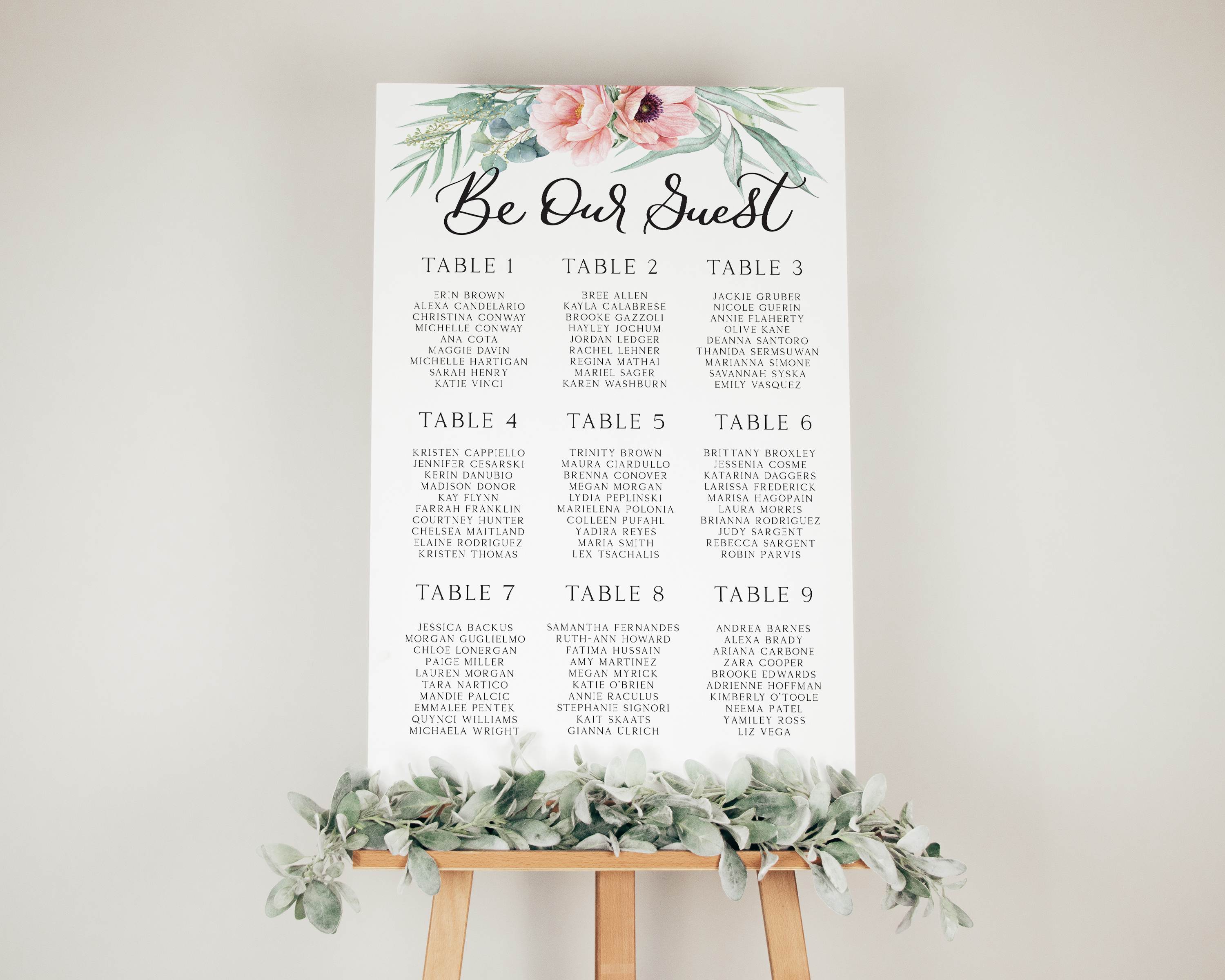 The guest list should be outlined in the order you wish it printed. We can do by table number or alphabetically. We can fit up to 20 tables or 250 guests.