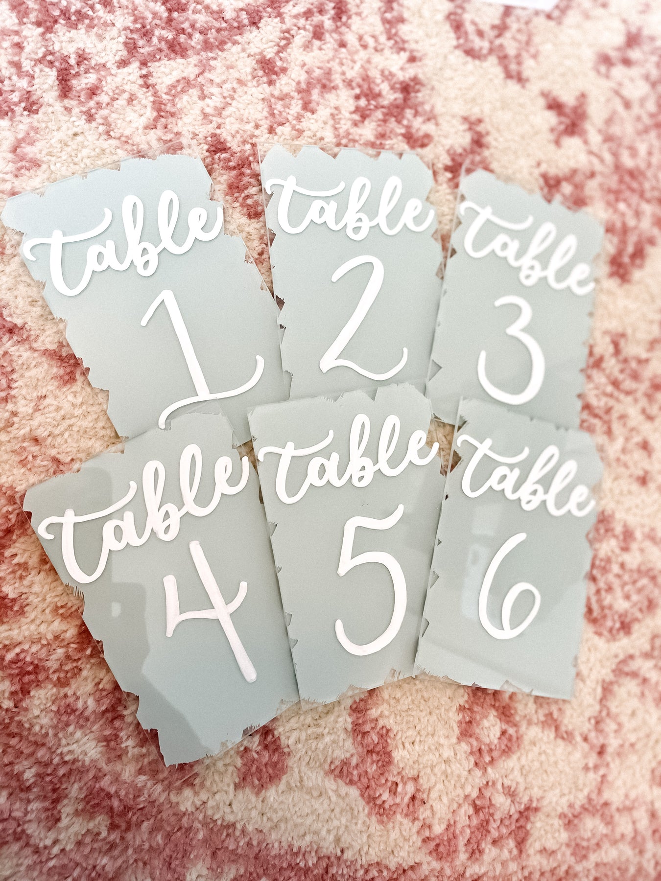 This listing is for 1 hand lettered, acrylic table number. Please increase the quantity on this listing to the amount of table numbers you will need.
